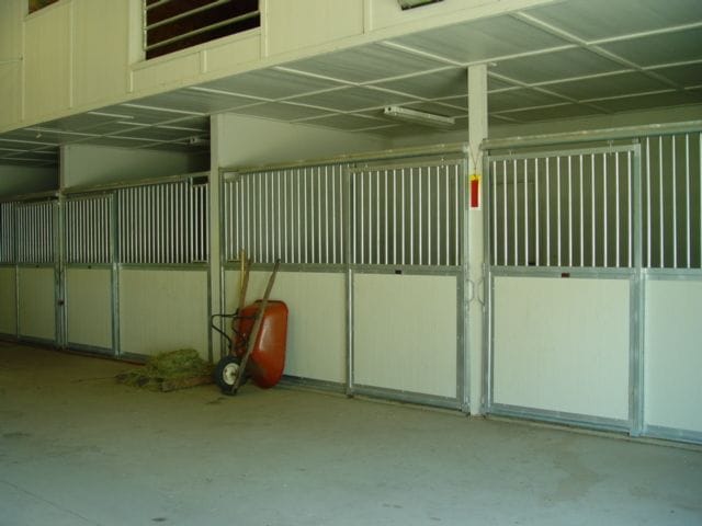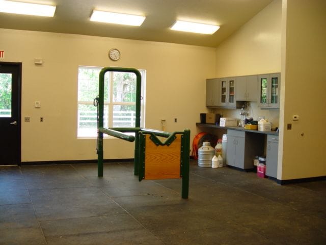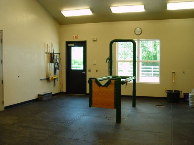In the equine section, there are four stalls for hospitalization with the adjacent turnout. A large treatment area is equipped with restraint stocks for reproduction and minor standing procedures and a surgery room for procedures requiring general anesthesia. There are adjacent rooms for digital and conventional radiography. Soft and hard surface areas are available for extensive lameness exams. A covered trailer parking area is provided for large animal arrivals. There is also a breeding phantom available for stallion collection at the clinic.