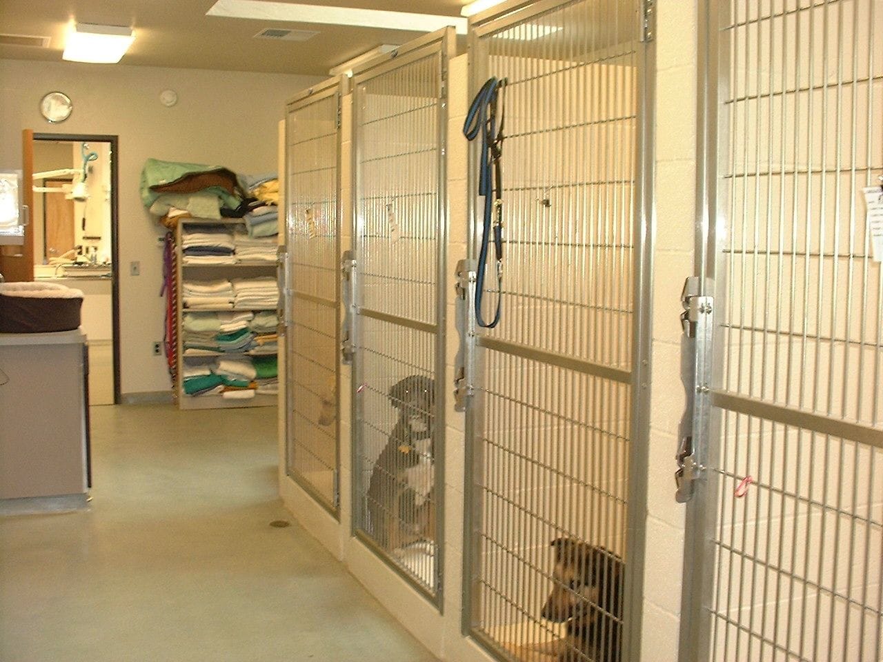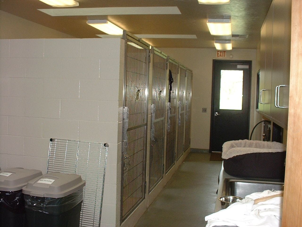 Areas are shared for instrument sterilization and in house laboratory testing. In the small animal section, there are four exam rooms, a well-ventilated canine ward with skylights, a separate cat ward, a complete surgical suite, and a treatment room with stations for minor surgical procedures and dental. Large runs are available for dog boarding. A completely separate isolation ward protects general patients from potential infectious diseases. A library and conference room is provided for client consultation and research study.